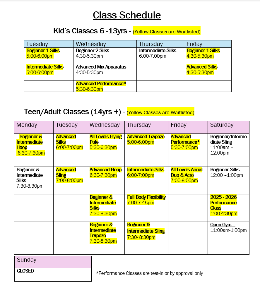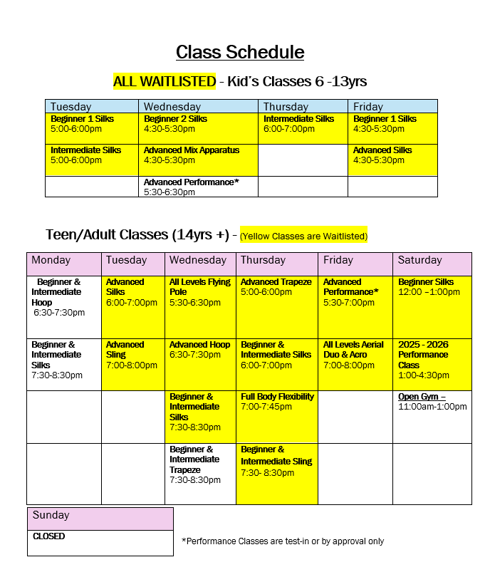 If you have any issues navigating the website or are confused about class availability, please email us at revelersaerialworks@gmail.com